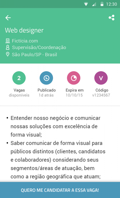 • Veja um resumo da vaga após a pesquisa efetuada e saiba de todos os detalhes com um toque: quantidade de vagas disponíveis, data de publicação, data de expiração e