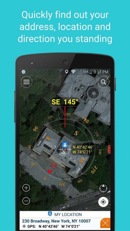 "Compass Pro" can use the Internet and GPS to find your location and address you standing. You can connect directly via Google Map by push on button "direction" on the top