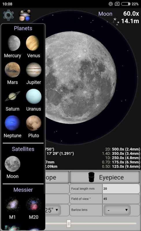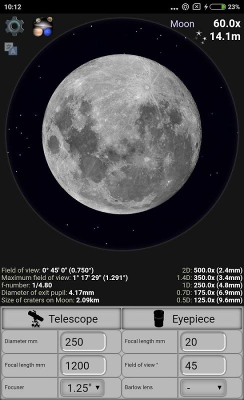 Calculation of parameters and characteristics of telescopes using different eyepieces and visualization.Settings: