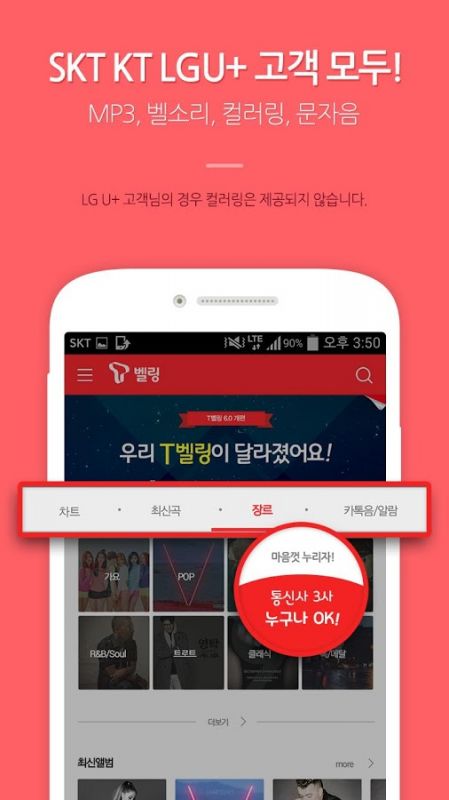 - اسم التطبيق: T벨링 - 컬러링, 벨소리, MP3, 카톡/문자음