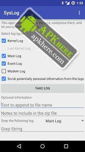 A simple open-source tool for quickly taking and sharing system logs.Root is required for Android 4.1+, and recommended for all versions.Log types supported:* Kernel logs (dmsg)* Last kernel log (last_kmsg, if device supports it)* Main log (Logcat)* Modem log* Event logs* SELinux audit logsAfter taking logs, it compresses them into a single zip, and allows you to share or upload them right away - great for helping debug system issues.New in v2.0.0: Support for viewing the current system logs in near-real time.You can also include notes within the zip, and append up to 10 characters to the file name.New feature in v1.2: Grep the logs for a string. This will run the logs through grep before adding them to the zip. This is case sensitive! It will also automatically add a line to the end of the notes describing which logs and what string was used.All the source is available at https://github.com/Tortel/SysLogLicensed under the GNU General Public License, version 2.Uses libsuperuser by Jorrit 'Chainfire' Jongma, available at https://github.com/Chainfire/libsuperuser, AppCompat v23, Material Dialogs by Aidan Follestad, and Android-Terminal-Emulator by Jack Palevich.The log scrubbing utility came from the CyanogenMod bug report tool
