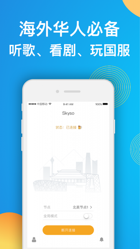 Skyso,是一款帮助海外华人访问国内APP的加速器,可畅快地访问优酷/爱奇艺/乐视/搜狐/bilibili/网易云音乐/QQ音乐/全民K歌/斗鱼/熊猫直播等国内资源。