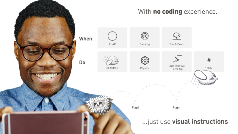 Choose from a library of hundreds of objects, programmatic behaviors like “bullet” and “tilt to move”, along with special effects. Coding becomes simple-- “WHEN this