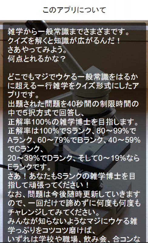 さあ!あなたもSランクの雑学博士を目指して頑張ってください! なお、問題は今後随時更新していきますので、一回だけで諦めずに何度も何度も チャレンジしてみてください。